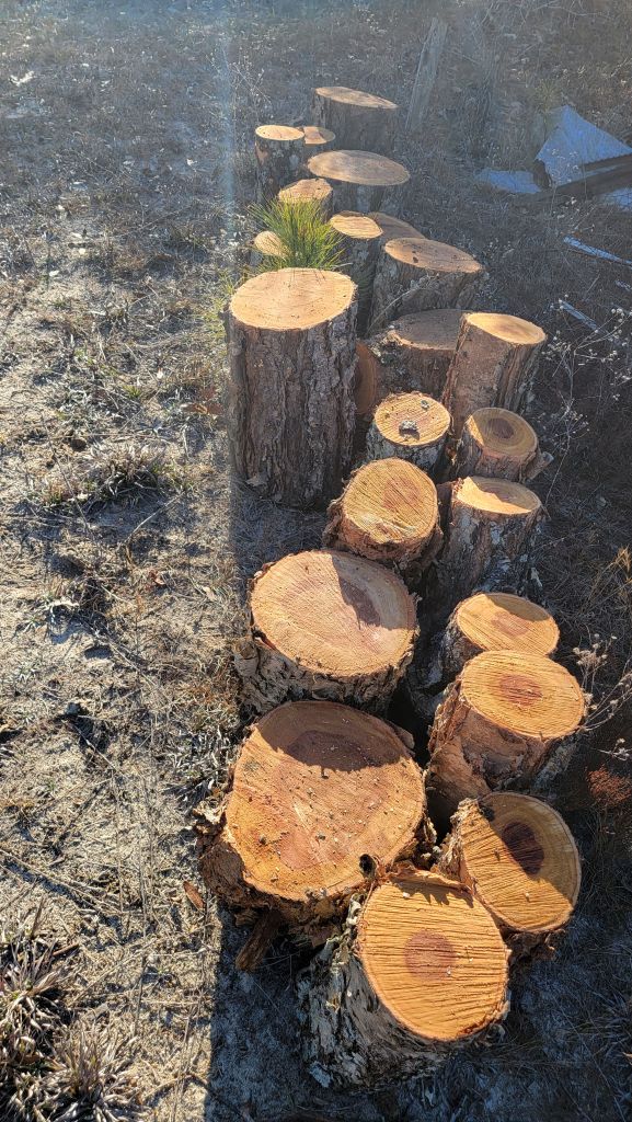 I had to go into town today and on my way in, I passed a yard where a tree company was removing a tree and had it cut into logs all over the yard. I stopped to see if I could get some of them and was told I could take them all! I didn’t, but I did get some good ones! I can use these as steps for dogs to get on/off obstacles and as a “stepping stones” path in the basic course.